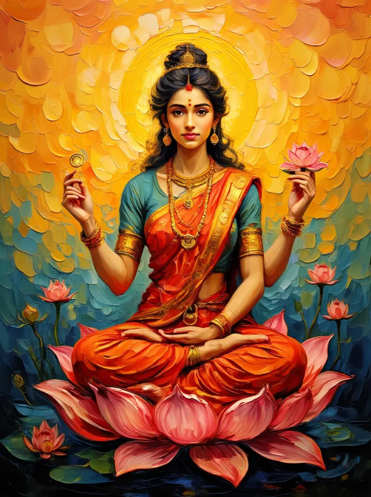 This stunning depiction of a goddess radiates serenity and power, seated gracefully on a blooming lotus. The vibrant palette of gold, orange, and teal blends beautifully to symbolize prosperity, divinity, and grace. Every intricate detail, from the shimmering jewelry to the textured strokes of the background, embodies the richness of traditional art reimagined through modern AI creativity.