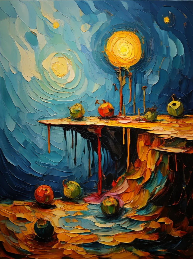 In “Celestial Harvest,” a collection of apples rests on the edge of a surreal cliff under a swirling, starry sky. Golden orbs and glowing celestial bodies hover in the background, casting a warm, otherworldly light over the scene. The cliff appears to be melting, with vibrant colors dripping and blending like molten lava, grounding this cosmic scene with hints of earthly decay and transformation. This artwork captures the delicate balance between reality and fantasy, inviting viewers to ponder life’s beauty, fragility, and mystery. 🍏✨