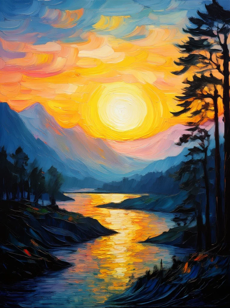 In “Golden Horizon,” the sun sits low on the horizon, casting its radiant light over a calm river, framed by distant mountains and silhouetted trees. The colors blend together in a symphony of soft pastels and bold hues, each stroke adding depth to the scene. This painting invites viewers to immerse themselves in a moment of tranquility, where natureโs beauty and serenity reign supreme. ๐ ๐ฒ