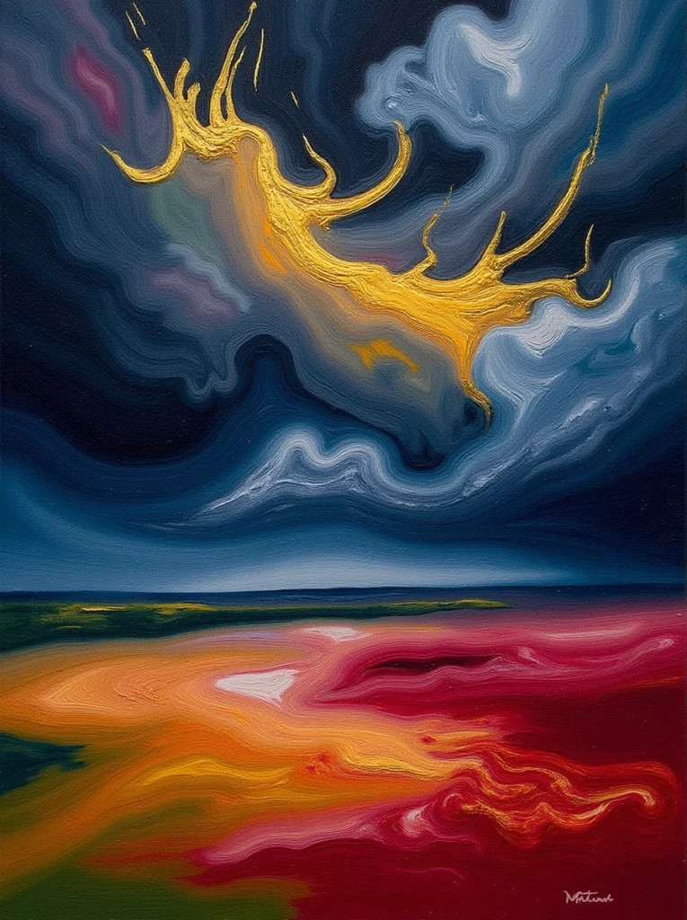 Discover the raw beauty of a surreal stormscape created by CraftedMedia. This stunning AI-generated artwork captures the drama of swirling clouds and vibrant colors that pulse with energy and mystery. The dark blue skies twist and turn with a golden burst of lightning-like energy, illuminating the scene with a surreal glow. Meanwhile, the landscape below blends fiery reds and warm oranges, creating a striking contrast that pulls you into a world where nature meets the abstract. 🌈🌩️🔥