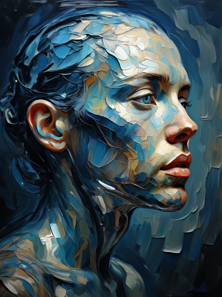 In “Ocean’s Reflection,” the subject’s face appears as though it is carved from ocean waves, each contour reflecting the colors and textures of the sea. The blues and grays ripple across her skin, creating an effect that is both mesmerizing and otherworldly. Her gaze is intense, as if she holds the mysteries of the ocean within her, representing the power, depth, and calm of water. This artwork captures the essence of fluidity and resilience, inviting you to dive into a world where humanity and nature merge seamlessly. 🌬️🌊