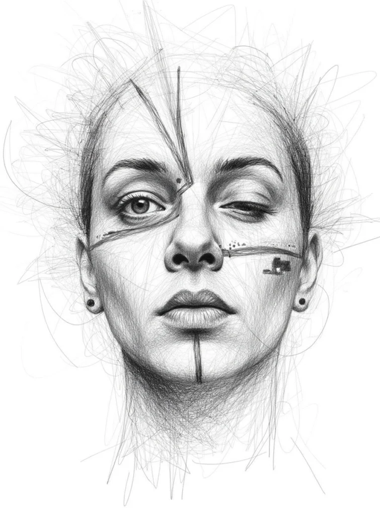 With a face divided by dark, deliberate lines and fragmented marks, this artwork explores the concept of hidden narratives within seemingly symmetrical structures. The subject’s closed eye and minimal expression add to the intrigue, suggesting a mysterious backstory. Each line, whether soft or bold, contributes to the enigmatic aura, making this piece ideal for contemplative spaces or galleries. 🎨🖌️