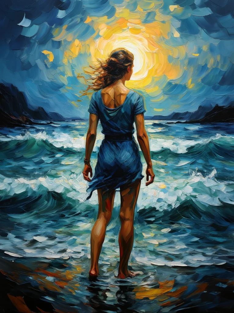 In “The Solitary Seeker,” we witness a young woman standing at the shore, her gaze fixed upon the golden sun as it melts into the ocean. Her hair dances with the breeze, and the waves crash at her feet, symbolizing both the peace and power of the sea. This painting tells a story of introspection, resilience, and the yearning to explore the unknown. The sun illuminates her path, casting warmth and hope across the cool blues of the water—a reminder of the beauty found in solitude and self-discovery. 🌊🌄