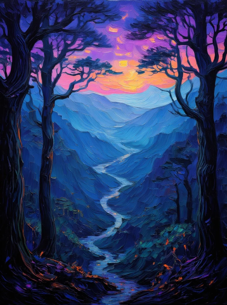In “Whispering Pines Valley,” the sun dips beyond the horizon, casting a soft pink and purple glow that breathes life into the valley below. The trees stand tall like silent guardians, framing a meandering river that flows through the lush, rolling hills. This painting captures the beauty of a quiet evening in a magical forest, inviting you to get lost in the endless possibilities beyond the winding path. It speaks to the wanderer, the dreamer, and those who find peace in the mysteries of nature. ππ«
